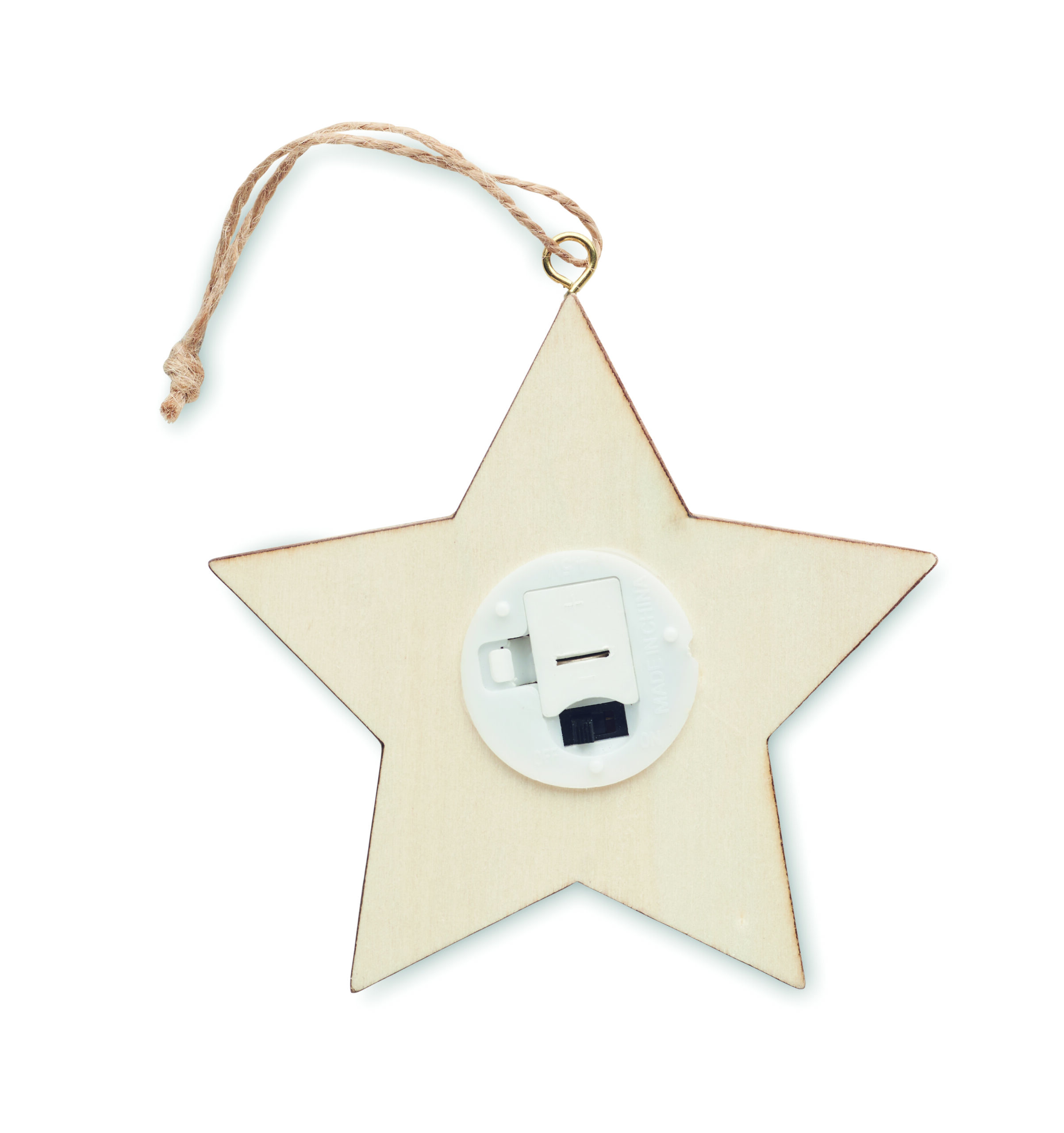 Gwiazda z płyty MDF z lampką w środku, z ozdobami świątecznymi i sznurkiem do zawieszania. Zawiera 3 baterie LR44.
