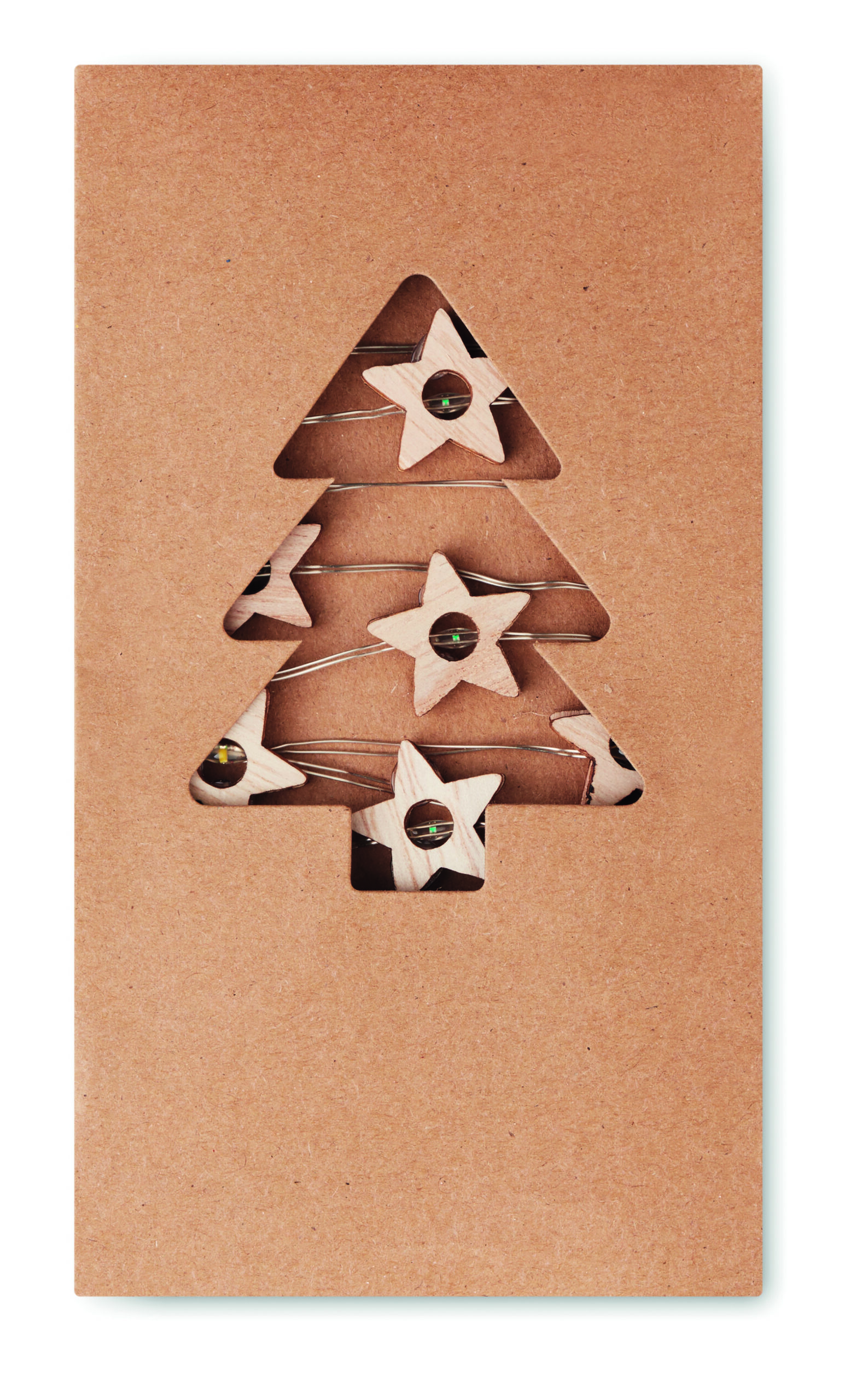 Łańcuch świetlny 20 LED, lampki w kształcie drewnianych gwiazdek. Zapakowany w kartonowe pudełko. 2 baterie AA nie dołączone. Przycisk włączania / wyłączania w obudowie baterii.