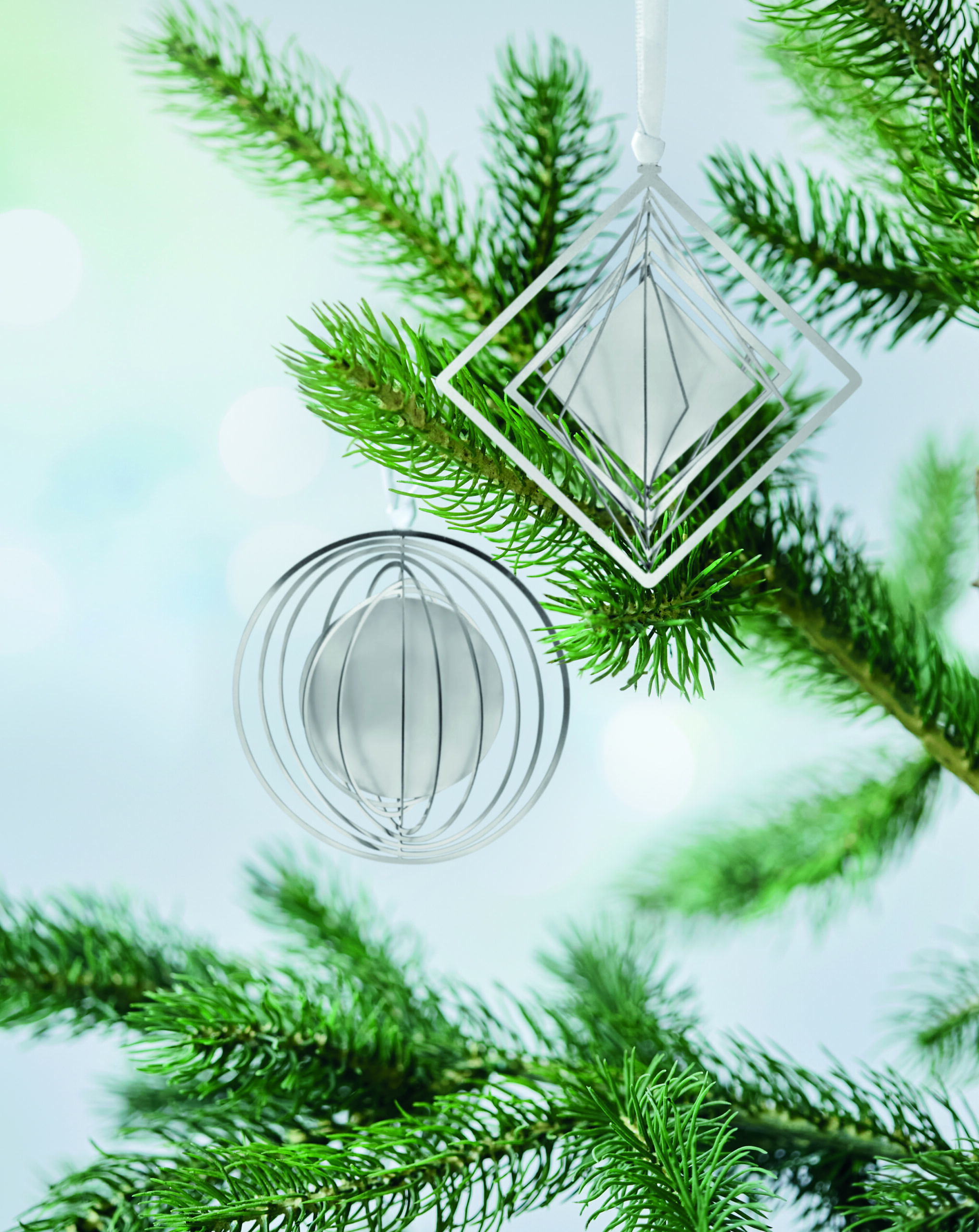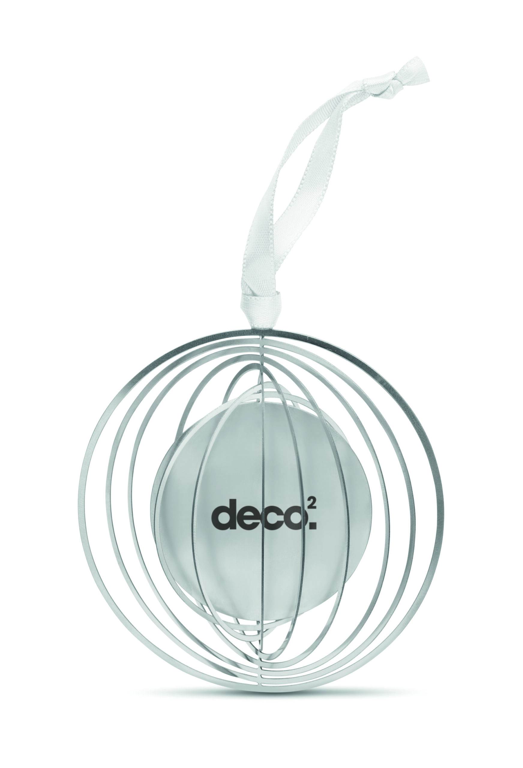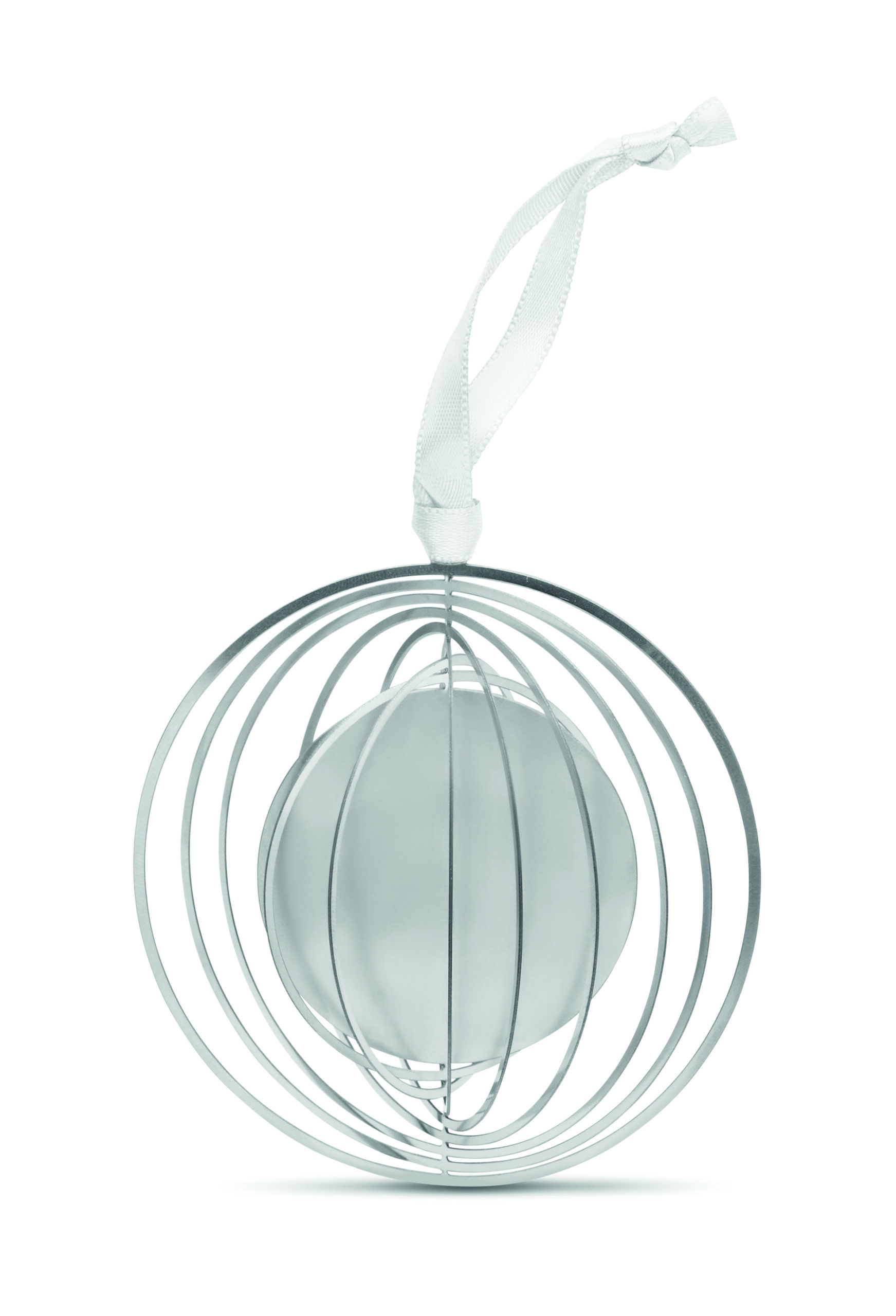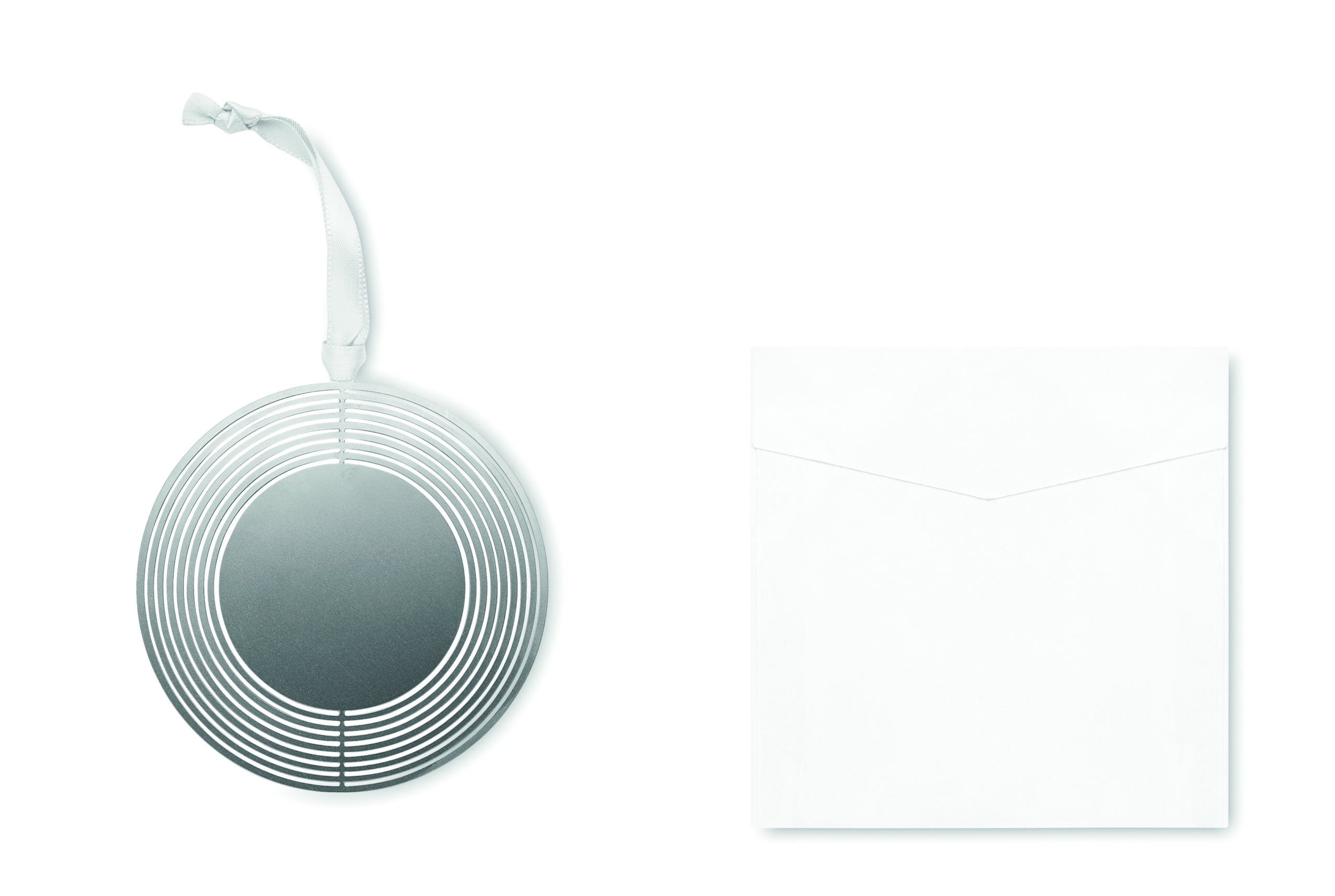 Dekoracja w kształcie koła ze stali nierdzewnej ze wstążką w kopercie prezentowej.