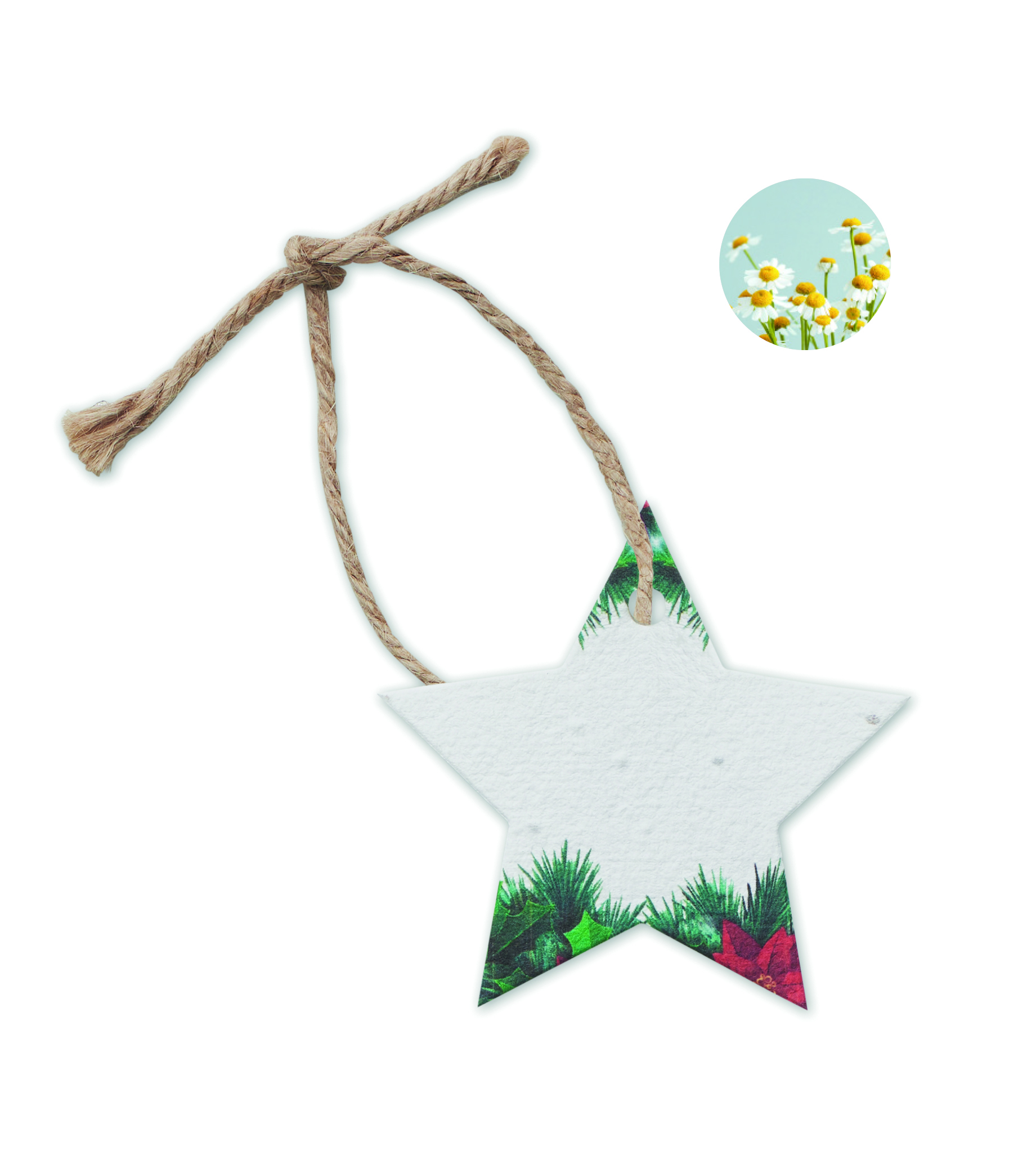 Miękki papier z nasionami dzikich kwiatów w kształcie gwiazdy z jutowym sznurkiem. Po wykorzystaniu posadź osłonę i obserwuj, jak rośnie na niej łąka dzikich kwiatów. Wyprodukowano w UE.