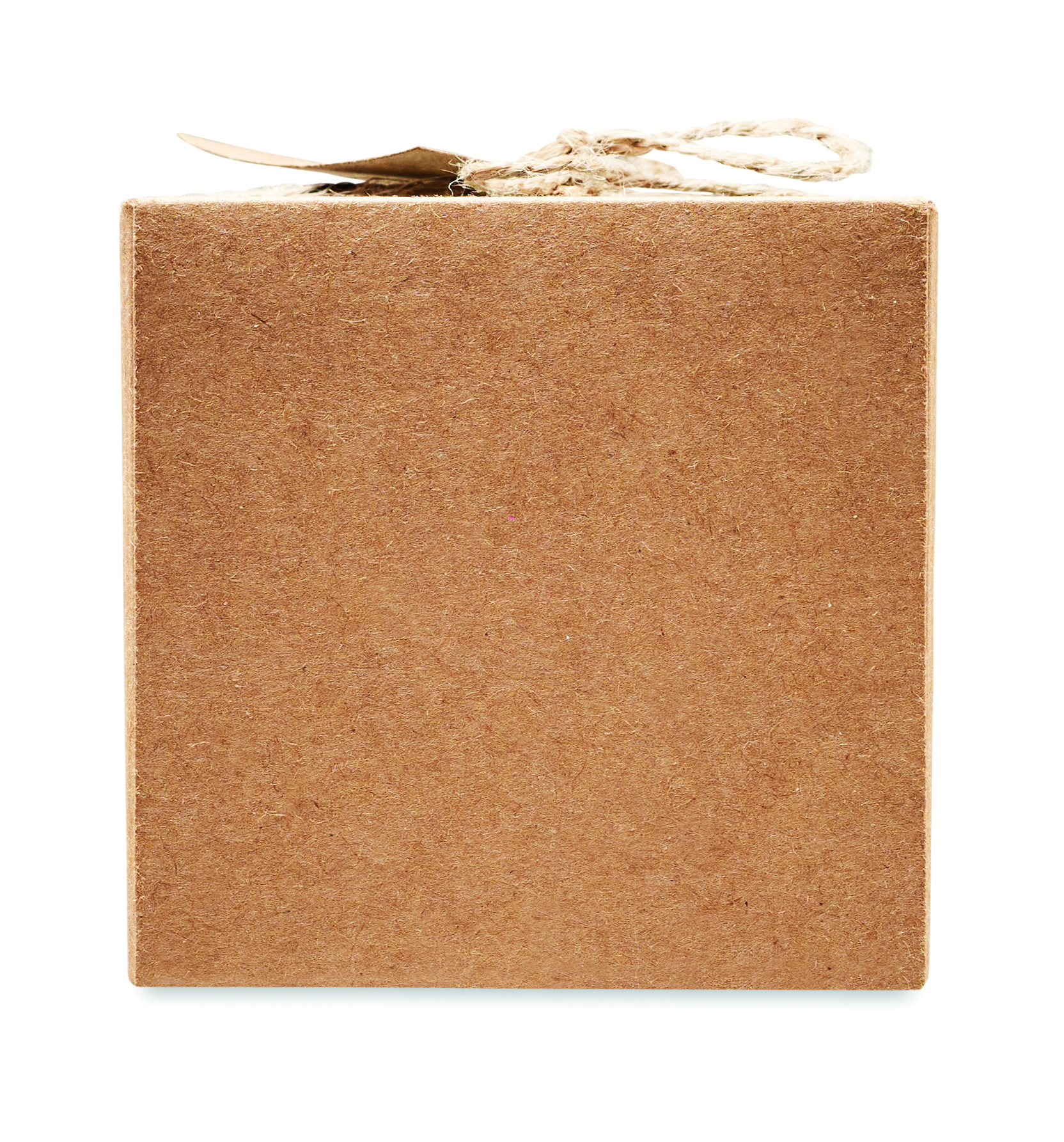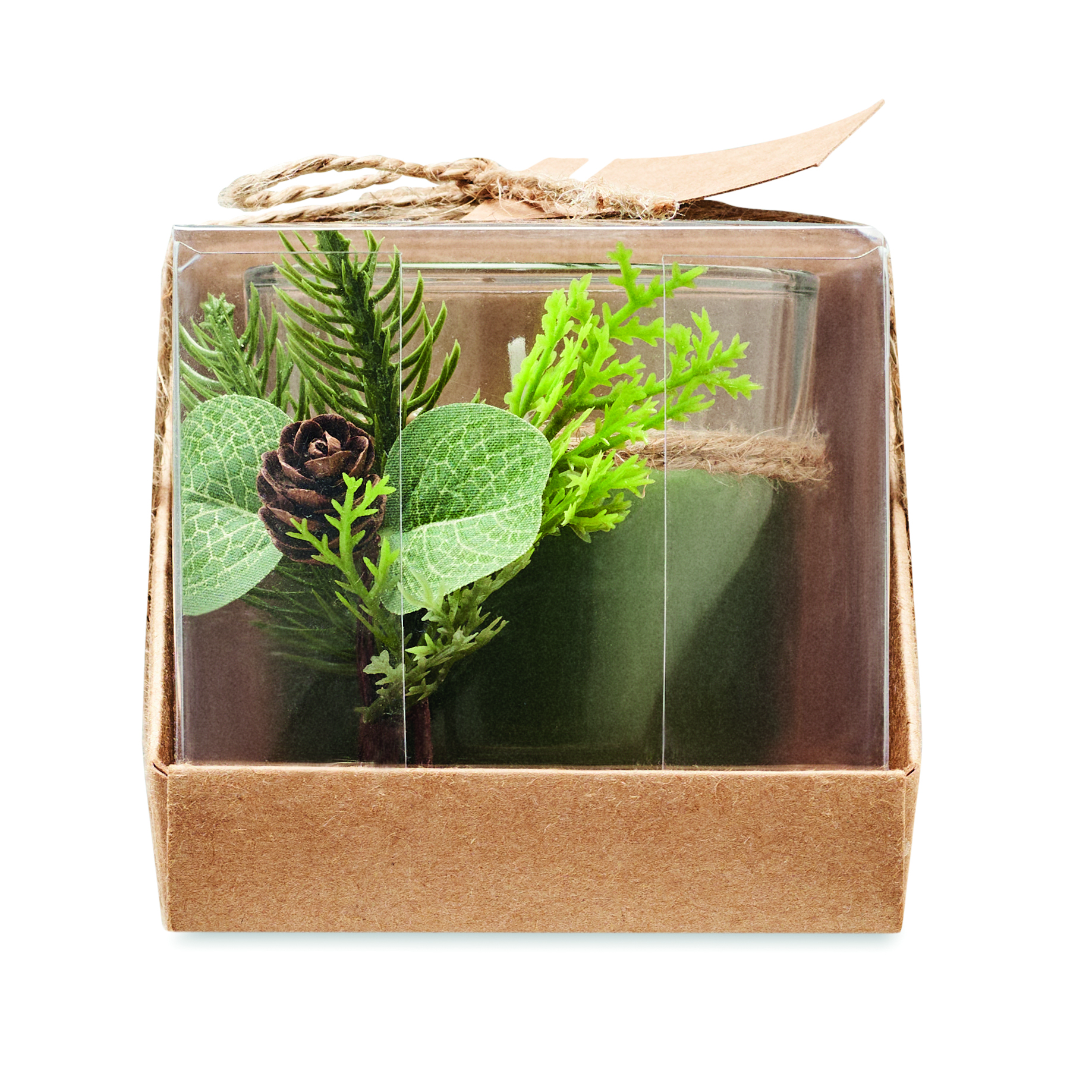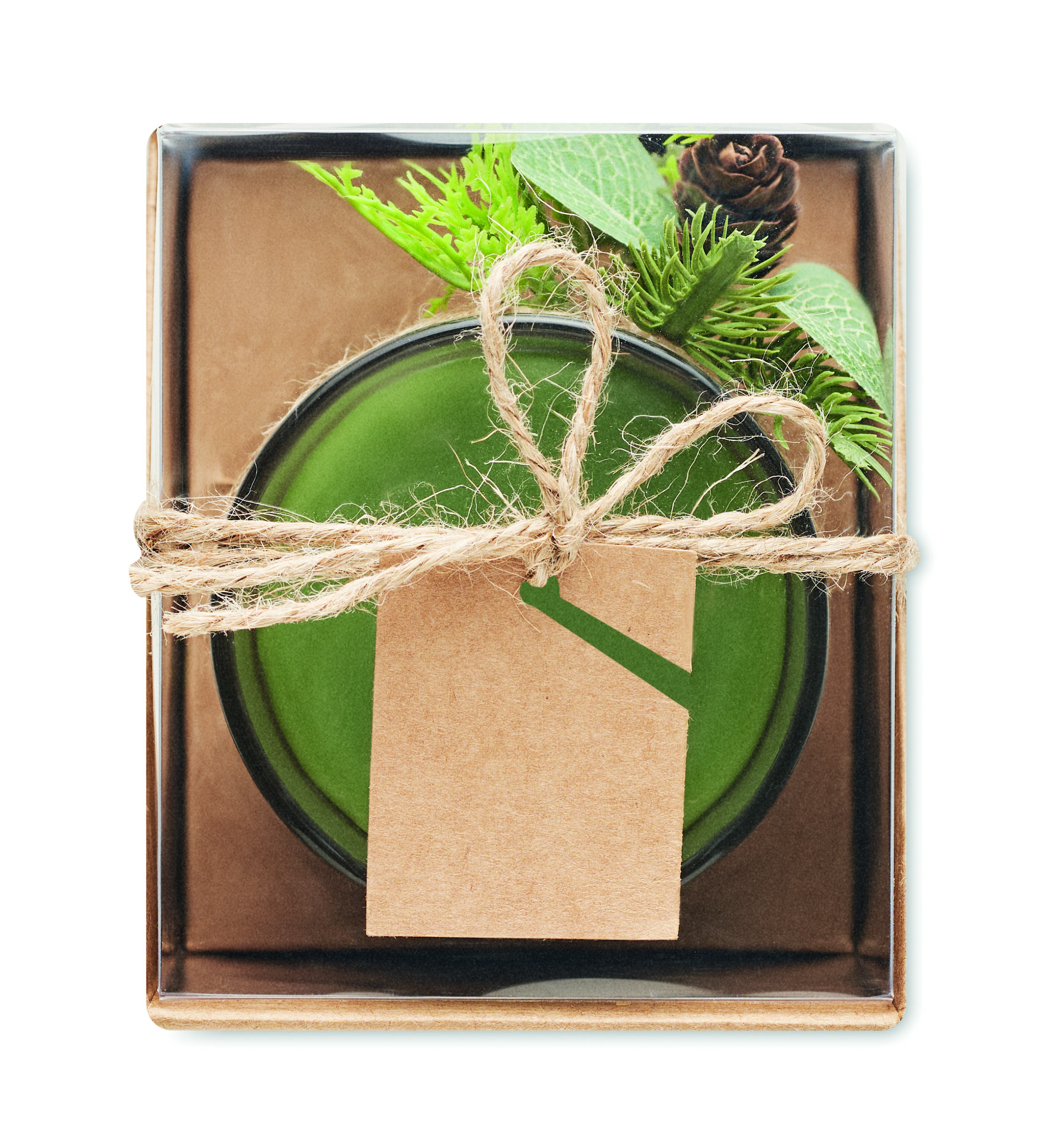 Szklany świecznik (120 gr) z aranżacją leśną. Zapakowany w karton i pudełko PVC, ze sznurkiem jutowym i etykietą z papieru kraft.