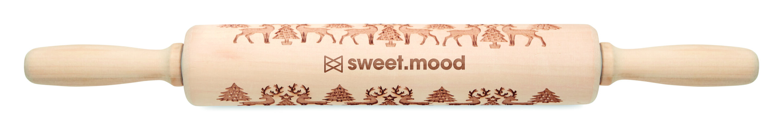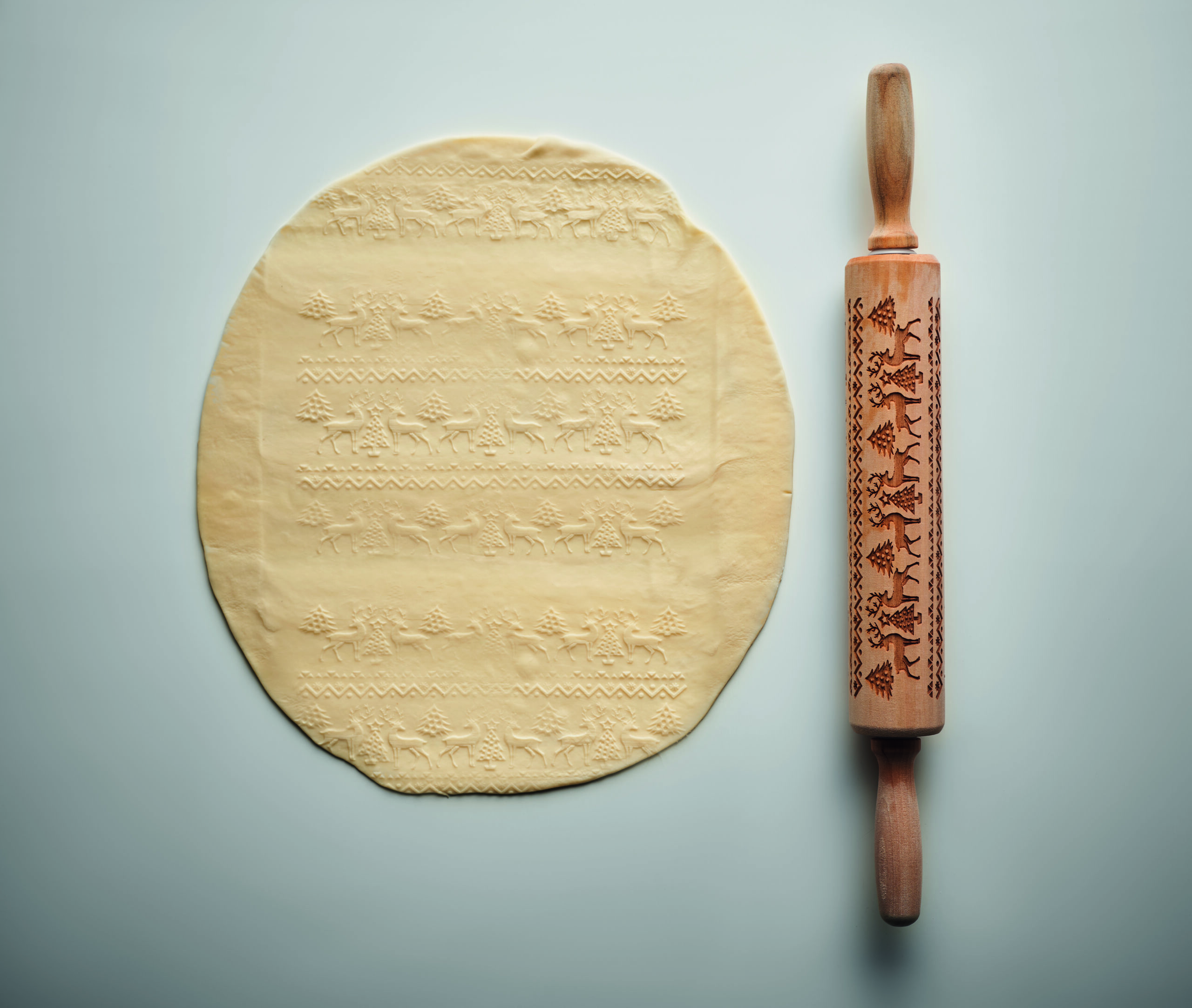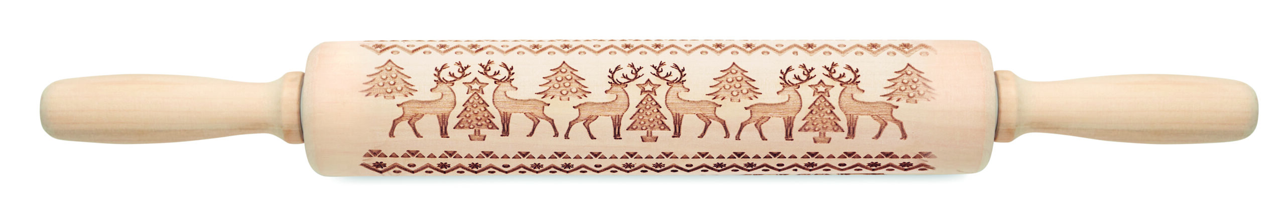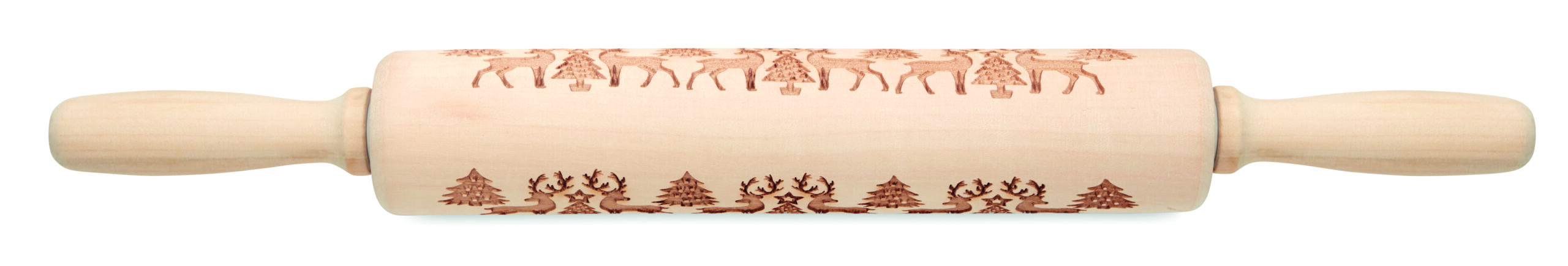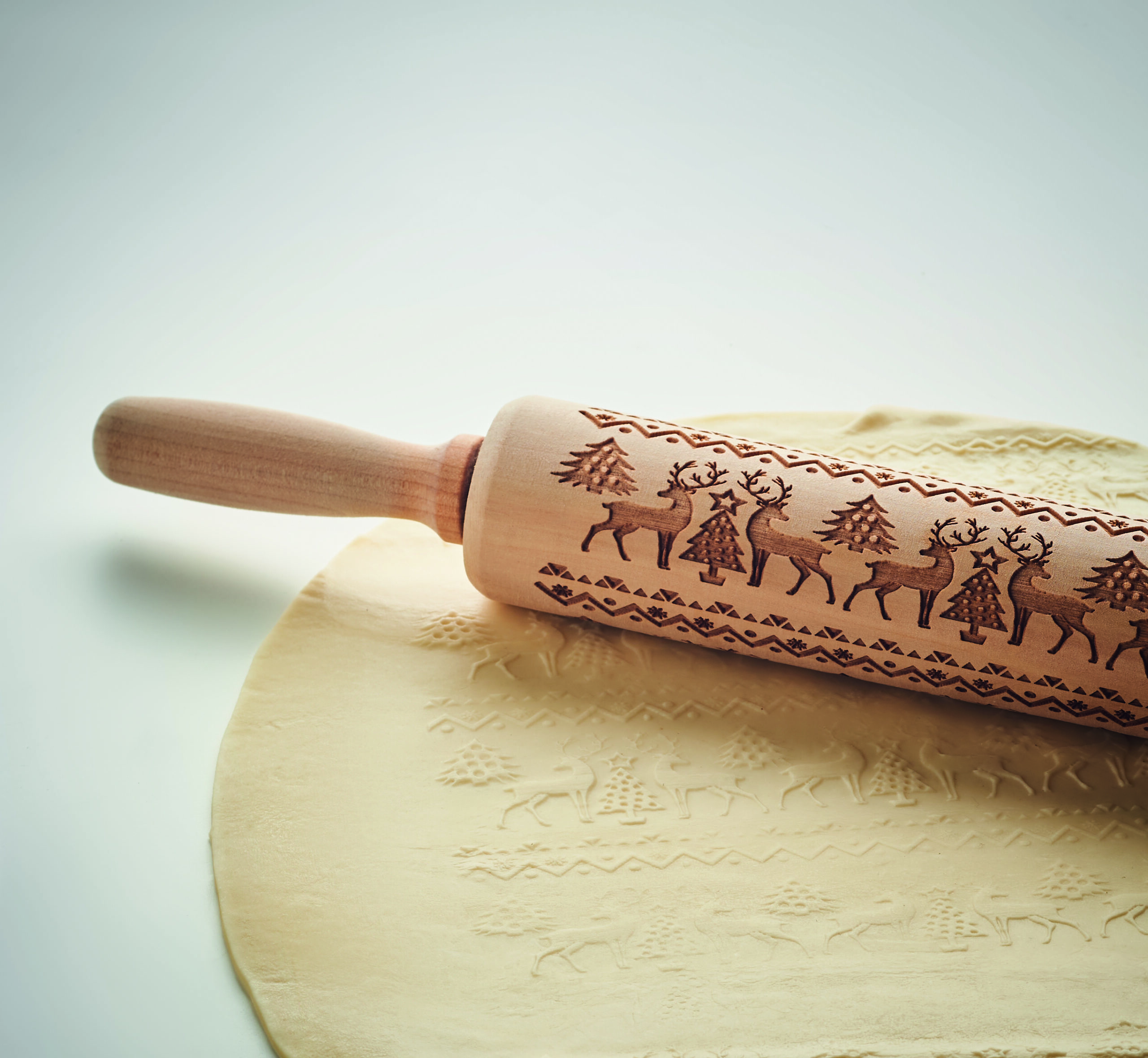 Drewniany wałek do ciasta z wytłoczonym wzorem świątecznym.