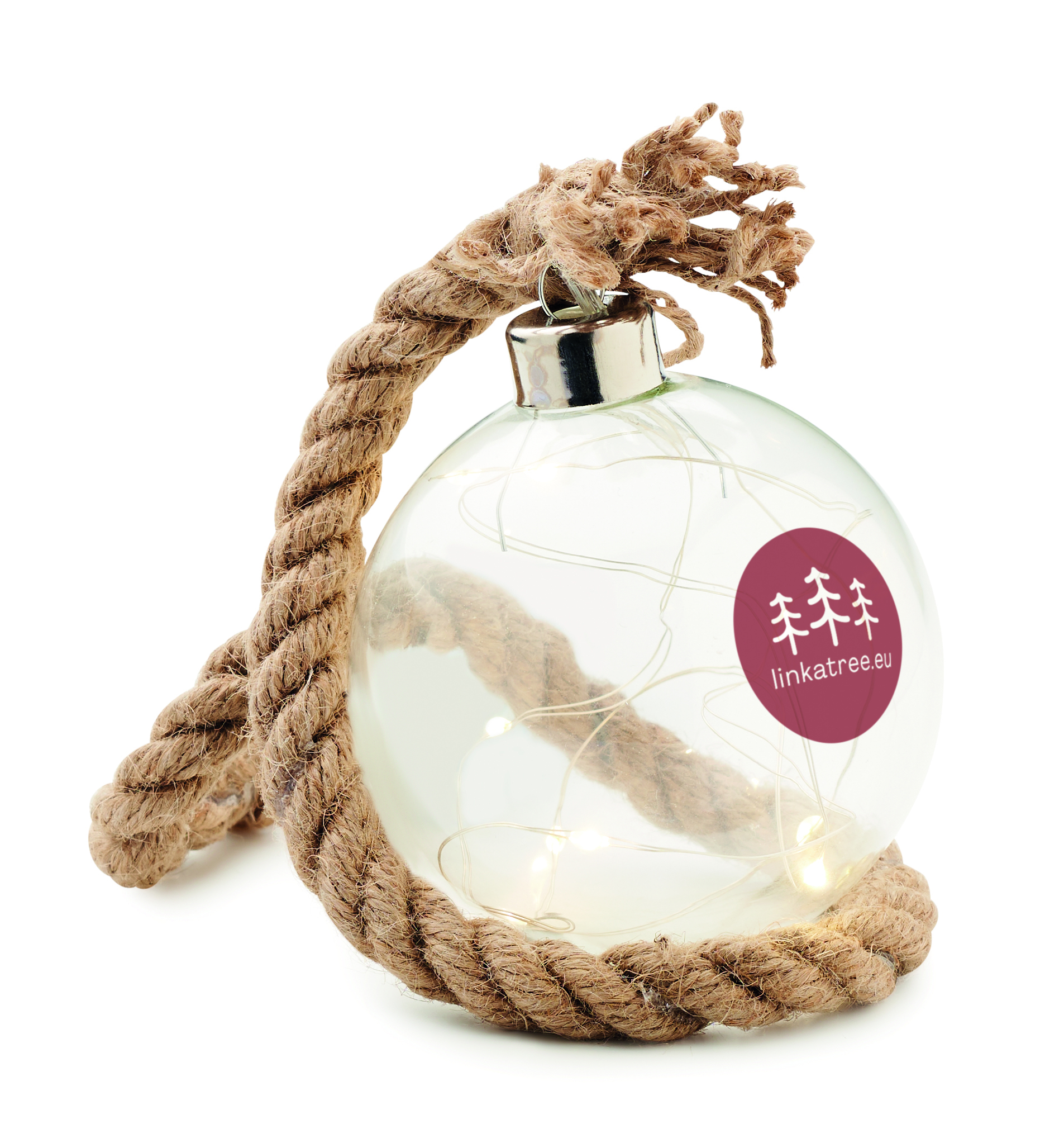 Szklana bombka z 8 diodami LED o ciepłej, żółtej barwie światła i sznurkiem jutowym. Nie zawiera 2 baterii AA.
