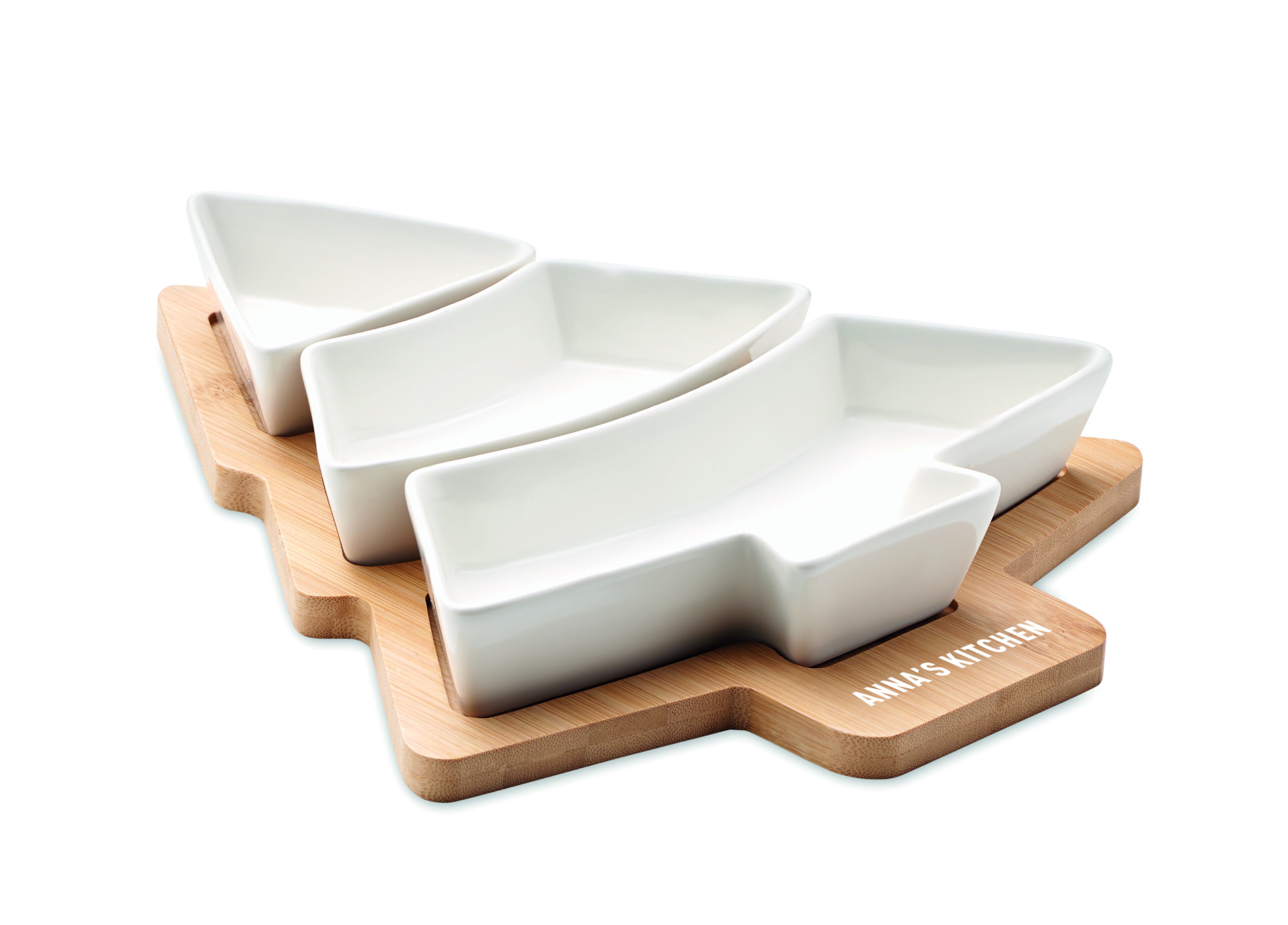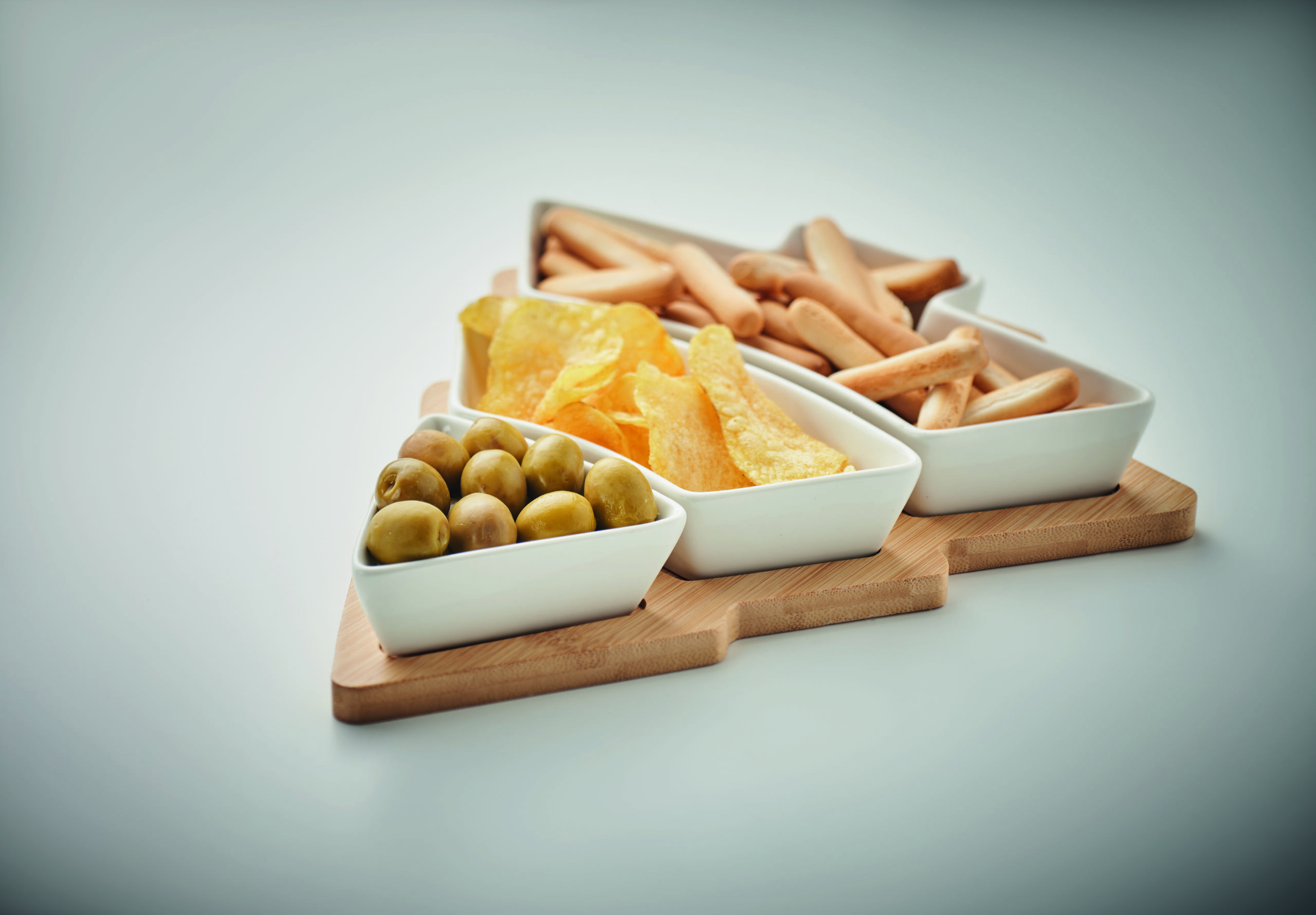Bambusowy półmisek w kształcie choinki, z trzema ceramicznymi naczyniami do serwowania. Bambus jest produktem naturalnym, dlatego mogą wystąpić nieznaczne różnice w kolorze, wzorze i rozmiarze.