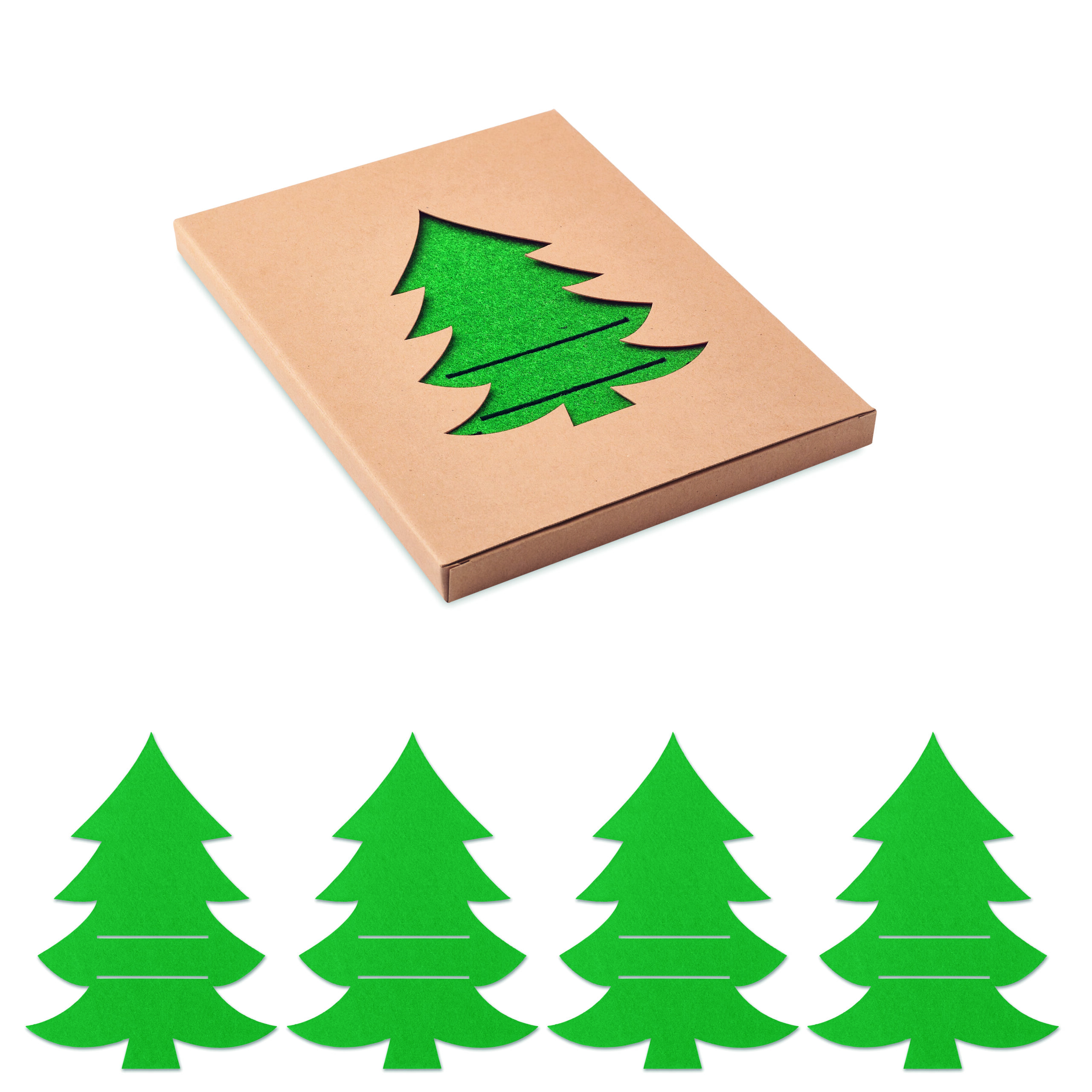Zestaw 4 podkładek pod sztućce z filcu RPET w kształcie choinki, zapakowanych w pudełko z papieru kraft.