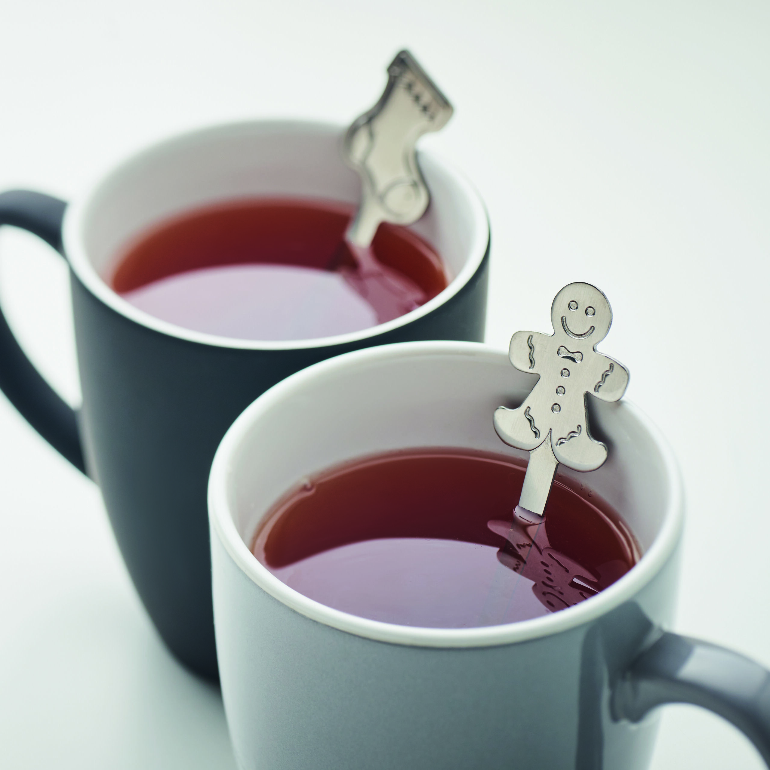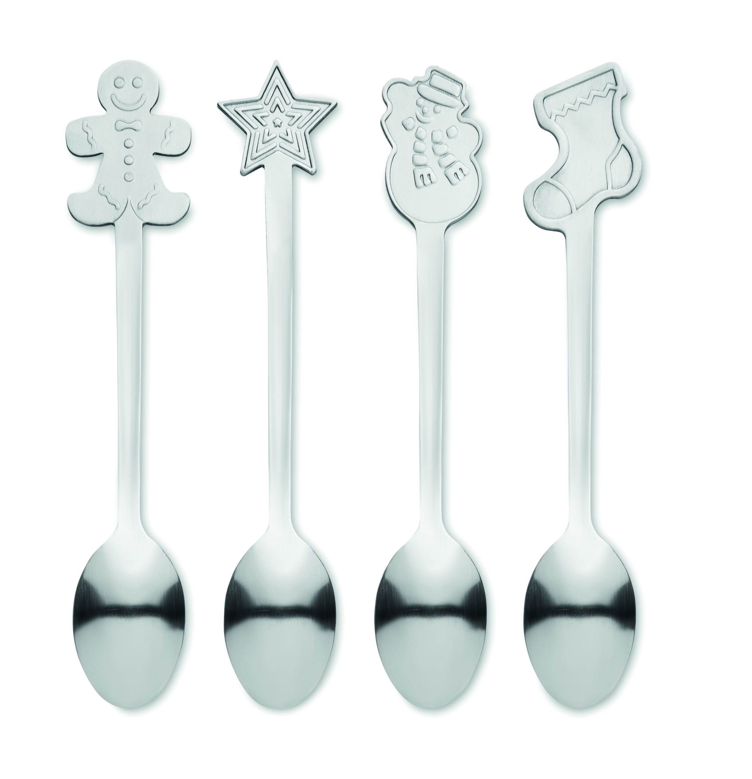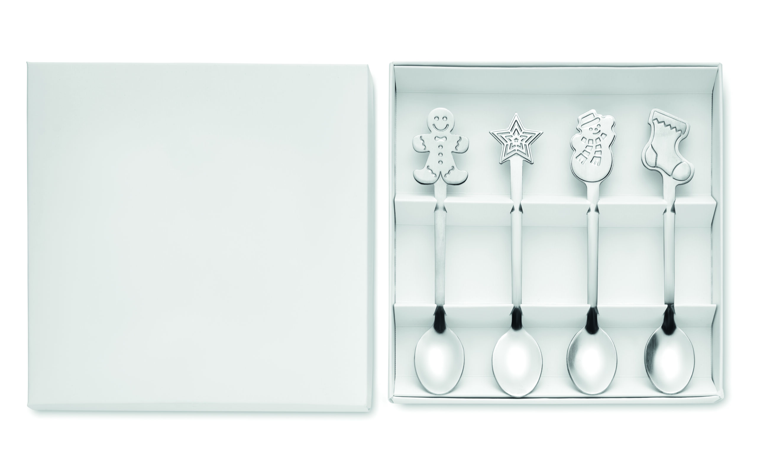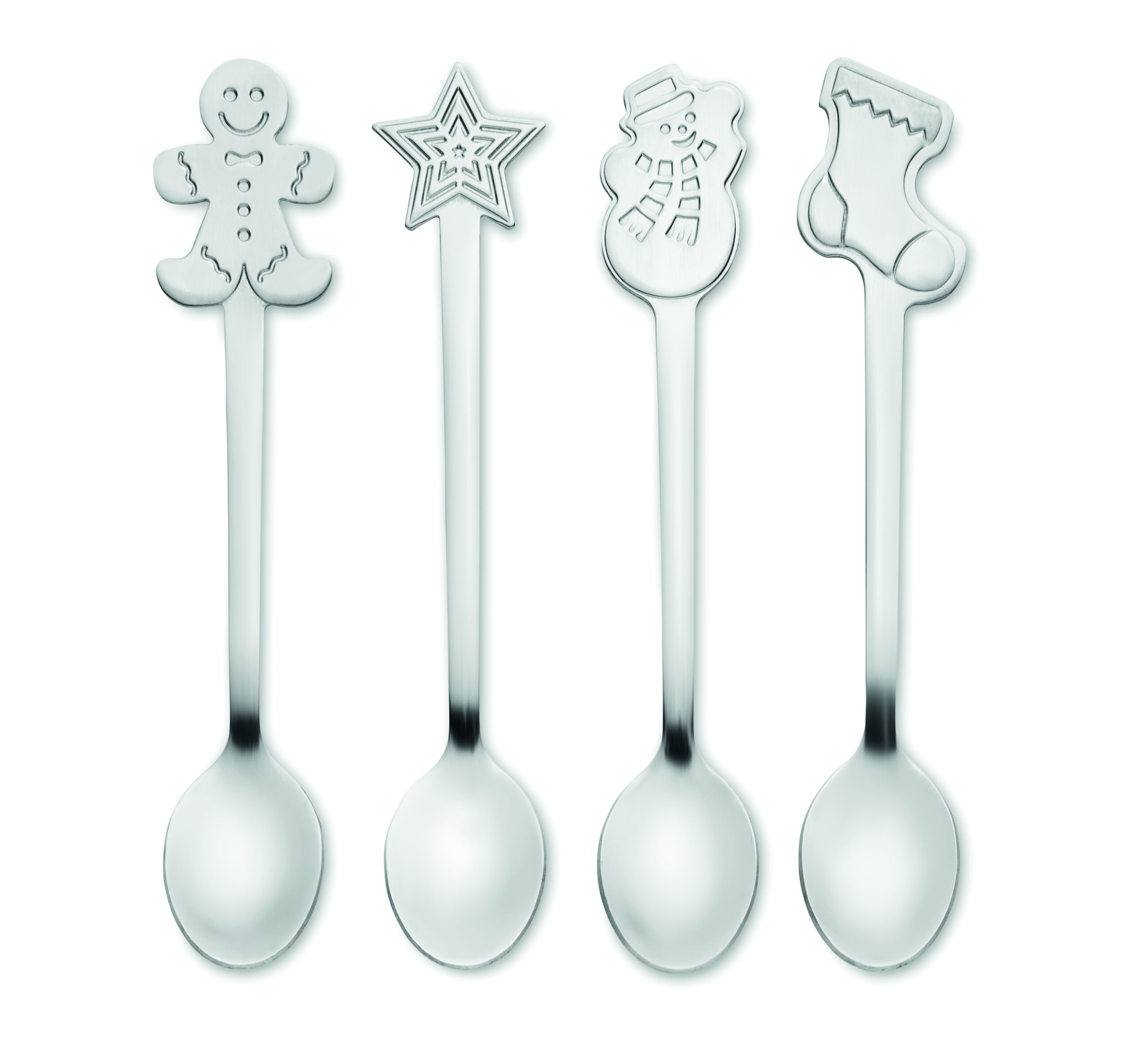 Zestaw 4 różnych łyżeczek do herbaty z motywem świątecznym ze stali nierdzewnej. Prezentowane w pudełku upominkowym.