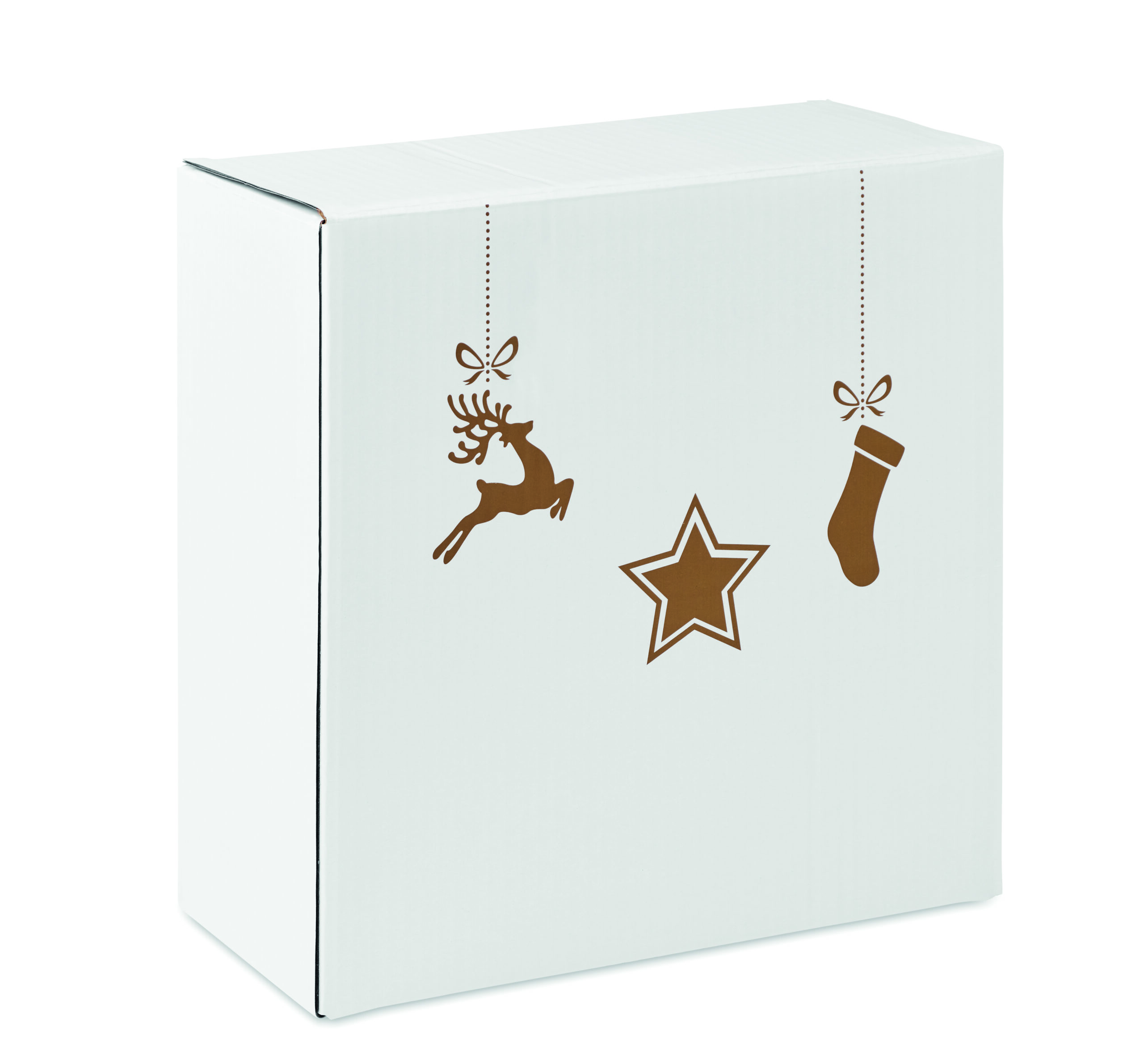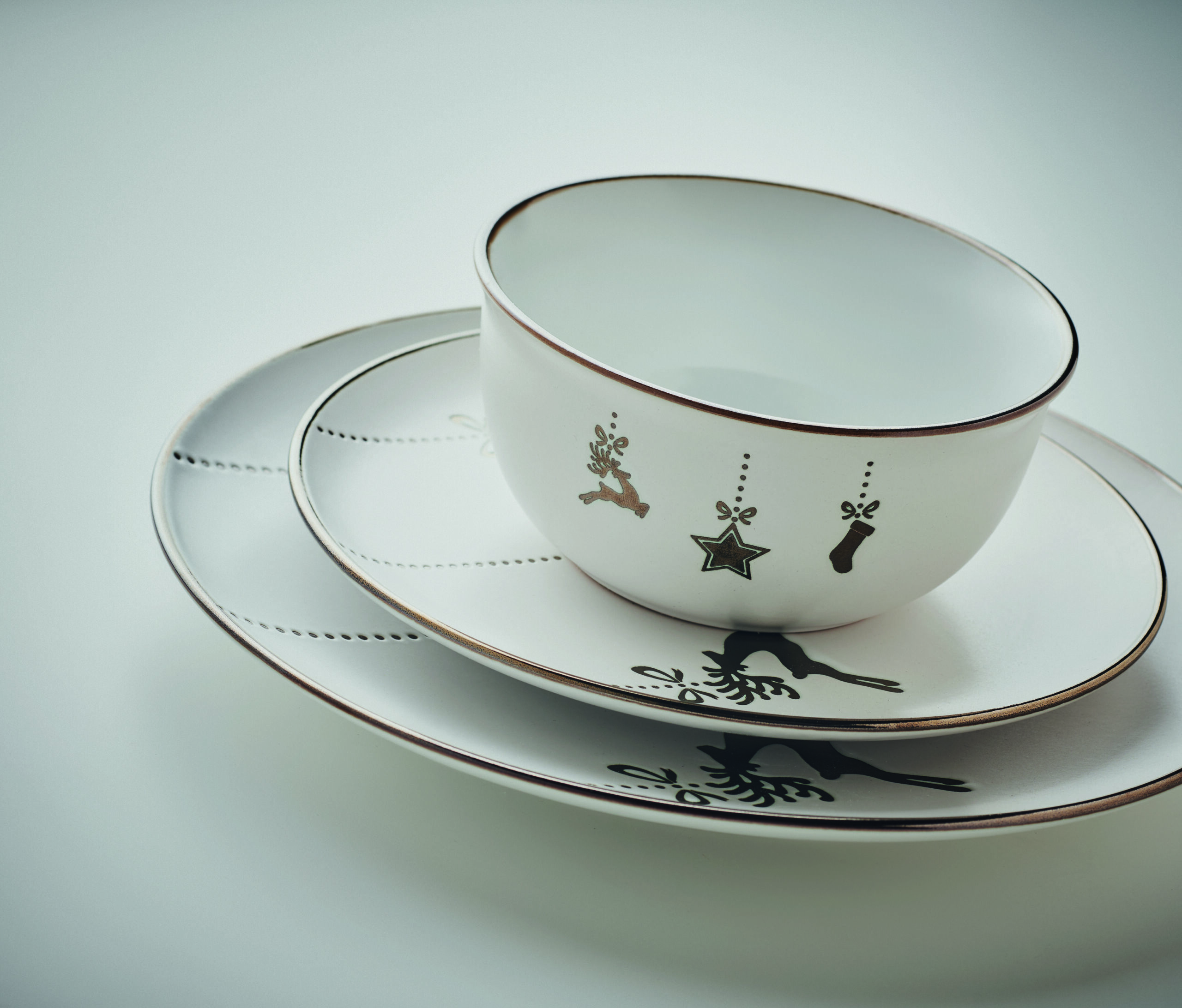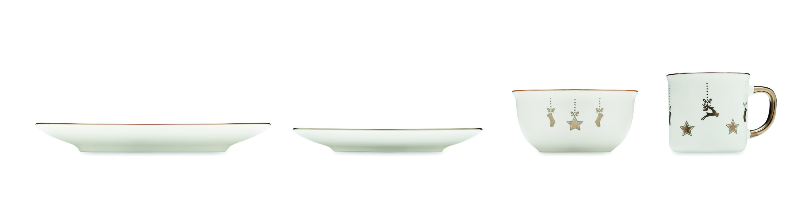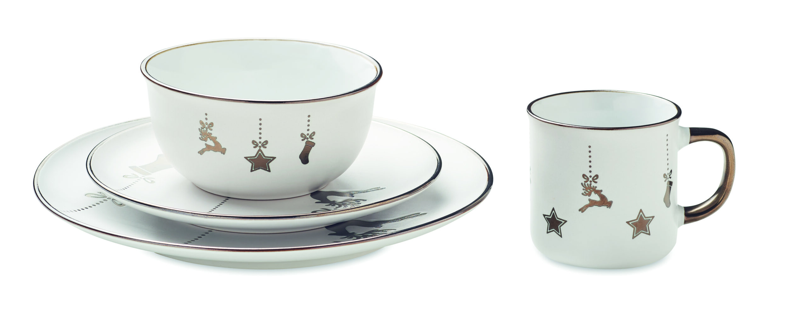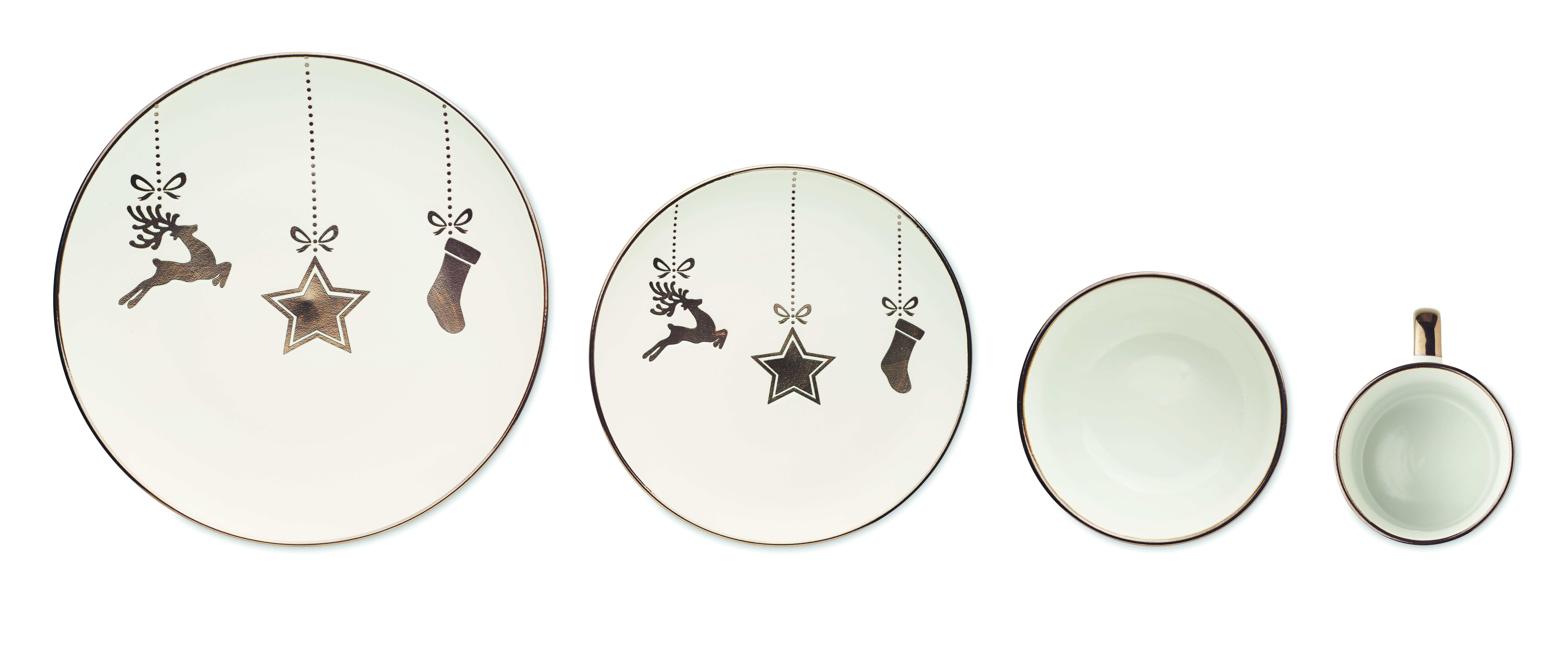 Świąteczny, 4-częściowy ceramiczny zestaw naczyń. W skład zestawu wchodzi: talerz obiadowy, talerz śniadaniowy, miska do płatków/sałatek (500 ml) i kubek (300 ml). Pakowany w pudełko prezentowe.