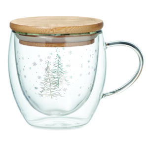 Świąteczny zestaw zawierający ceramiczny kubek, zaparzacz oraz mini talerzyk. Zapakowany w upominkowy kartonik z wierzchem z PVC, przewiązany ozdobną wstążką z etykietą.